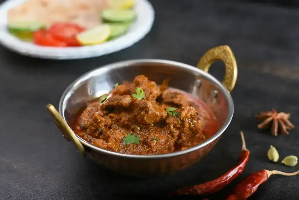 Slow cooked tender beef, curry sauce made with garam masala, turmeric and coriander, sliced onions, ginger, ground almonds